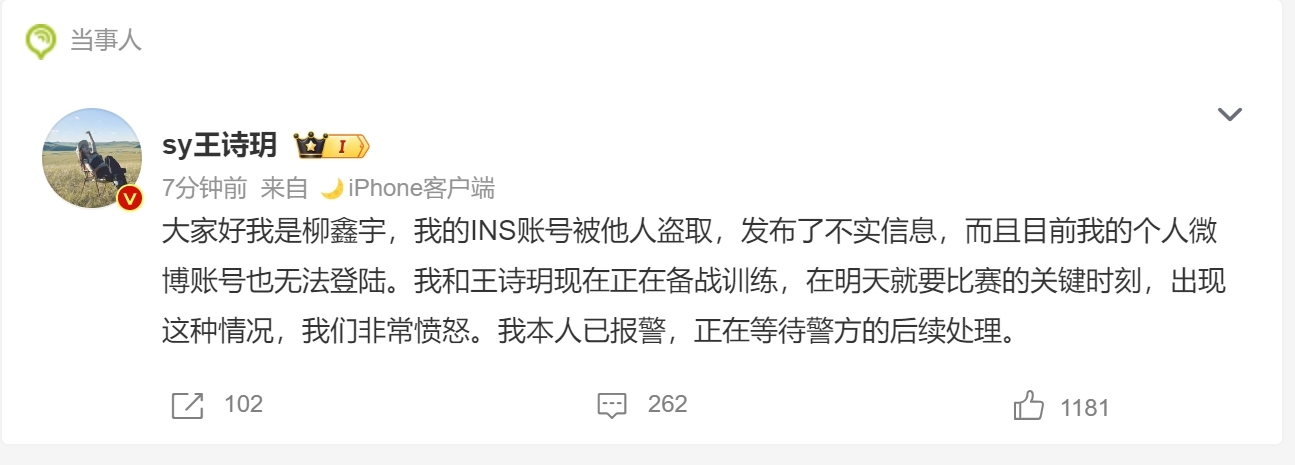 2月20日中午,微博认证账号“sy王诗玥”发布声明,称柳鑫宇国外社交媒体被恶意盗号,发布内容均不是本人发布,现已报警处理。随后该账号再次发布消息,“大家好我是柳鑫宇,我的INS账号被他人盗取,发布了不实信息,而且目前我的个人微博账号也无法登陆。我和王诗玥现在正在备战训练,在明天就要比赛的关键时刻,出现这种情况,我们非常愤怒。我本人已报警,正在等待警方的后续处理。”