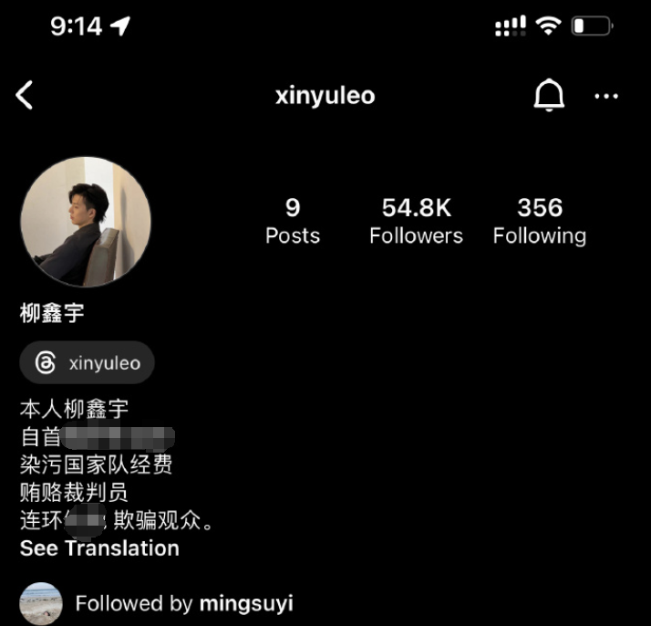 此前,柳鑫宇的INS账号发布消息,“本人柳鑫宇自首染污国家队经费,贿赂裁判员,欺骗观众。”后续更是曝出更多细节,称他感情史非常混乱,甚至在比赛训练期间,柳鑫宇都不“消停”,还拿着队里的经费外出嫖娼。