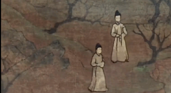 △顾恺之《洛神赋图》卷(局部摹本),故宫博物院藏。魏晋南北朝画作中,山水仅作为人物故事的背景出现,人物往往画得比山还大