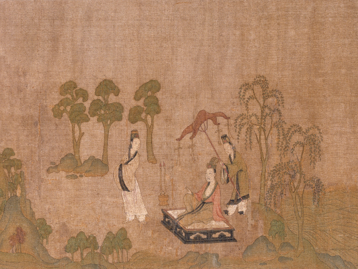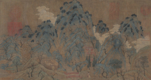(绢本:指画作绘制在丝绢上。设色:指在画作上施加颜色,区别于仅用墨色的“水墨画”。)