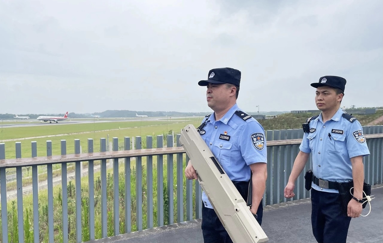 7月18日,东部新区公安分局草池派出所的民辅警背着分局配发的无人机反制枪,与“净空观察哨”队员在公园里开展巡逻工作:检查机场防护网是否遭到破坏,在观察哨瞭望是否有风筝、气球等升空物体干扰航班的情况,向游客进行净空安全知识的宣传。