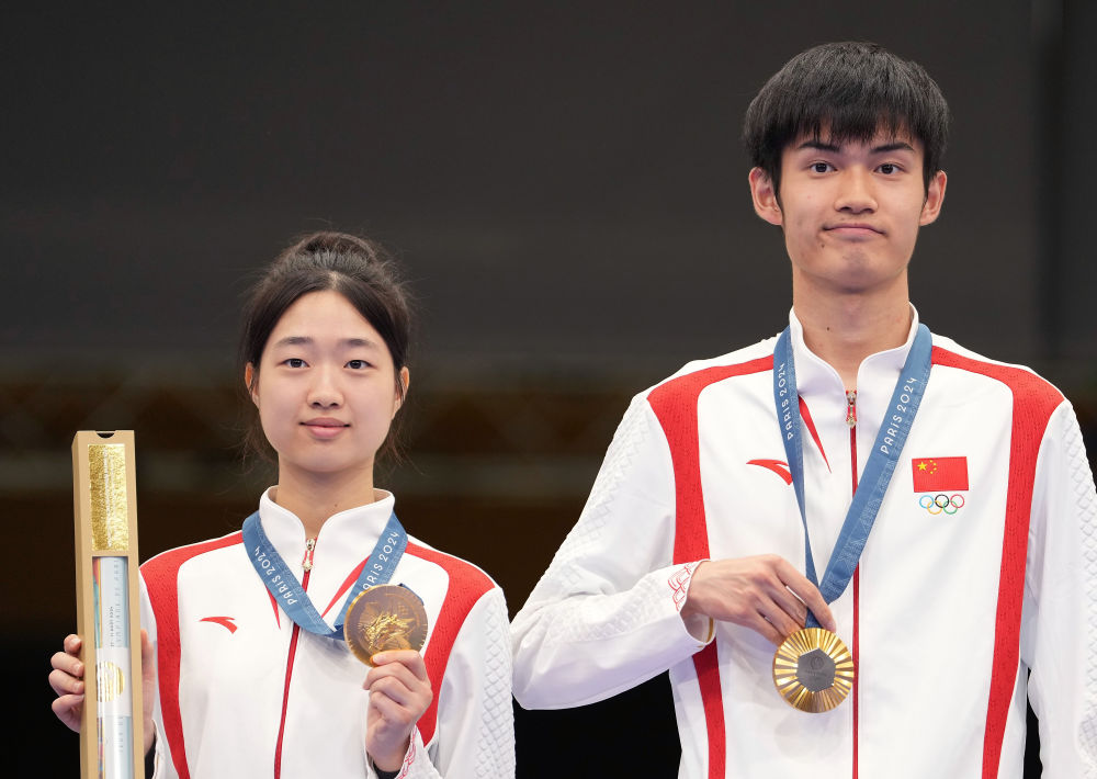 7月27日,冠军中国选手黄雨婷(左)/盛李豪在颁奖仪式上。当日,在法国沙托鲁举行的巴黎奥运会射击10米气步枪混合团体决赛中,中国选手黄雨婷/盛李豪夺冠,赢得巴黎奥运会首枚金牌。新华社记者 鞠焕宗 摄