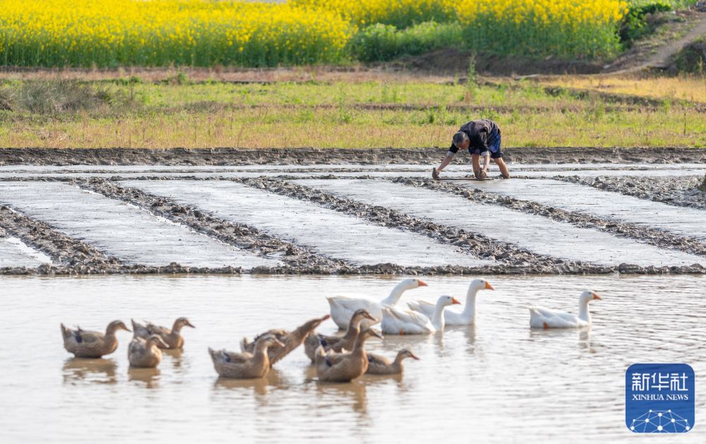 3月17日,重庆市南川区东城街道永生桥社区村民在平整秧田。新华社发(瞿明斌摄)