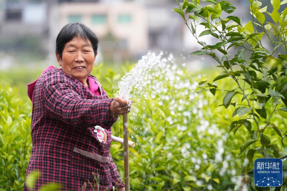 3月17日,在重庆市北碚区澄江镇一柑橘种苗基地,工人在给柑橘种苗浇水。新华社发(秦廷富摄)