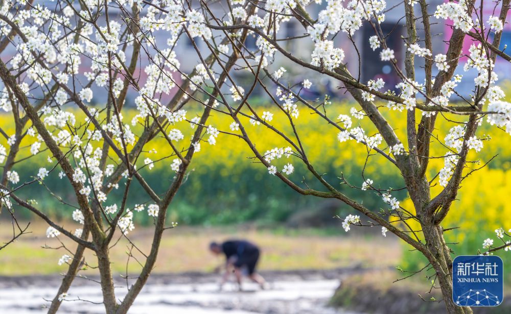 3月17日,在贵州省铜仁市玉屏侗族自治县朱家场镇混寨村,村民在李花间整地。新华社发(刘德军摄)