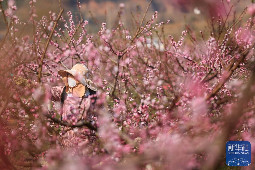 3月17日,在云南省曲靖市沾益区盘江镇河西村桃园基地,果农在果园进行管护作业。新华社发(孙文来摄)