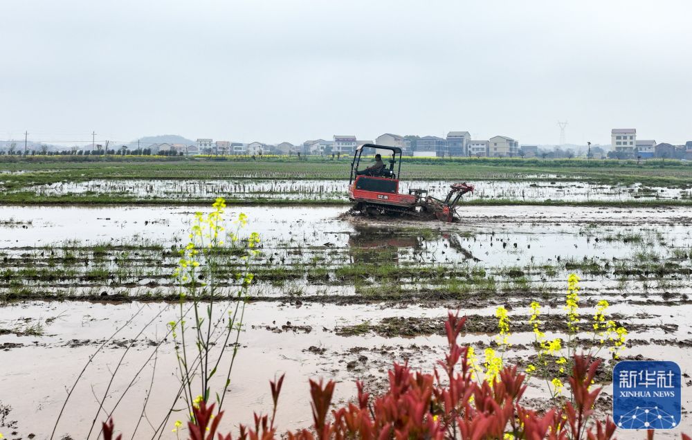 3月17日,在湖南省衡阳市衡阳县西渡镇青里村,村民驾驶农机翻耕农田(无人机照片)。新华社发(周秀鱼春摄)