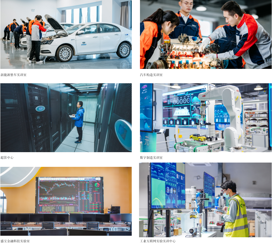 学校依托企业办校优势,与行业领军企业合作建设“汽车工程实验实训中心”“工业互联网实验室”“超算中心”“盛宝金融科技研究中心”等一批高精尖实验实训室;高标准建设了“实践基地和产业学院”“实验教学示范中心”共享性实训基地,为学生提供真实多维度的实习实训及生产应用场所。