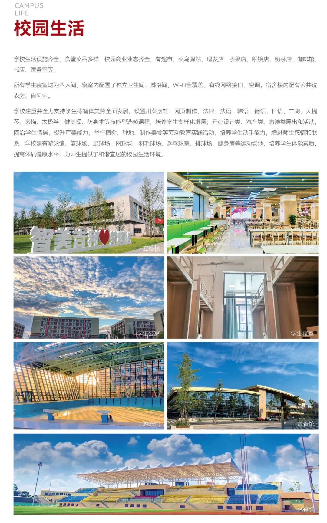 学校注重并全力支持学生德智体美劳全面发展。设置川菜烹饪、网页制作、法律、法语、韩语、德语、日语、二胡、大提琴、素描、太极拳、健美操、防身术等技能型选修课程,培养学生多样化发展。开办设计类、汽车类、表演类展出和活动,陶冶学生情操,提升审美能力。举行植树、种地、制作美食等劳动教育实践活动,培养学生动手能力,增进师生感情和联系。设立游泳馆、篮球场、足球场、网球场、羽毛球场、乒乓球室、排球场、健身房等运动场地,培养学生体能素质,提高体质健康水平,为师生提供了和谐宜居的校园生活。