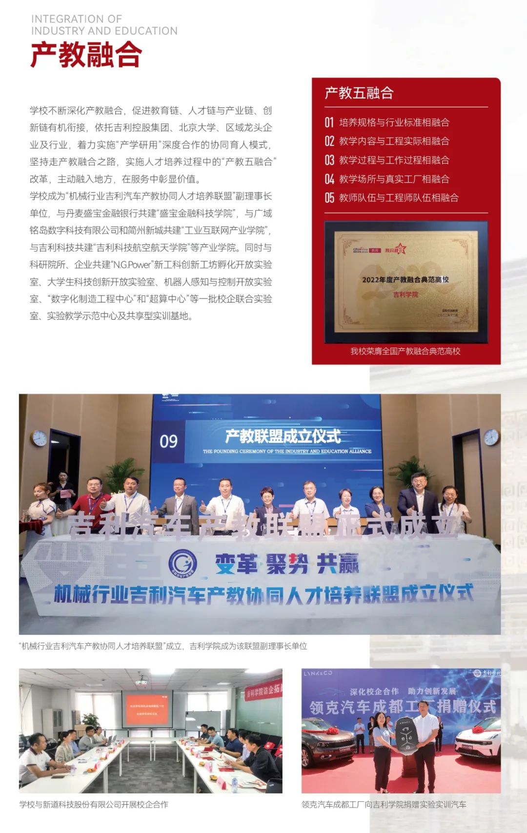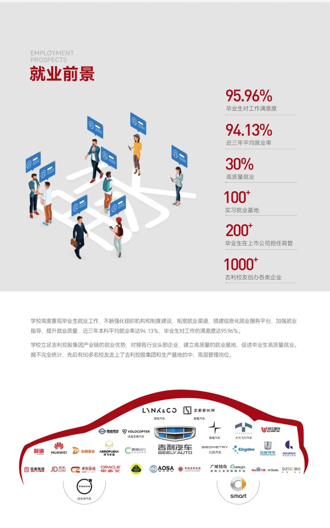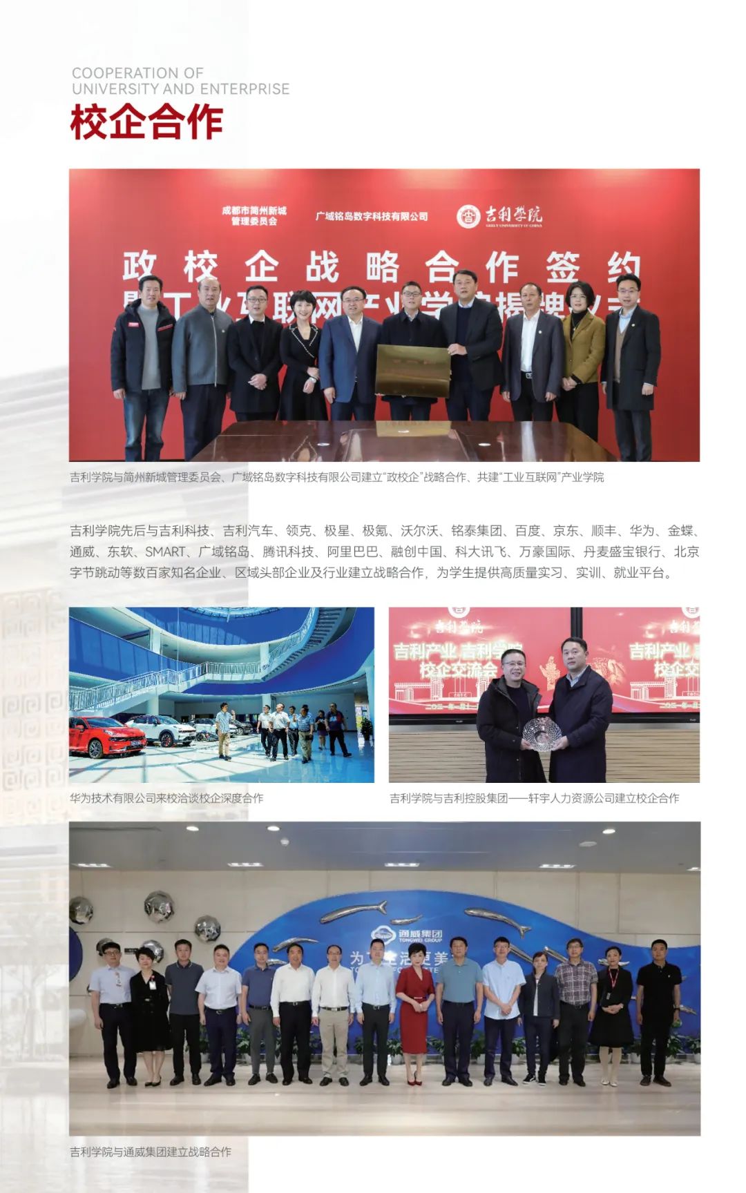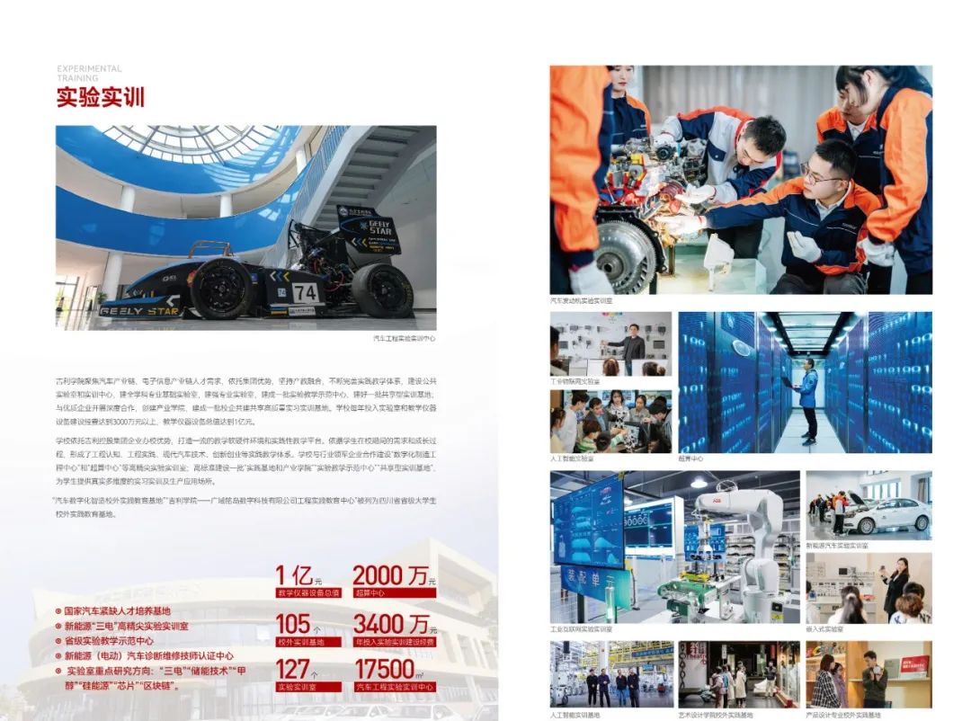 紧紧依托吉利控股集团在产业、技术、人才领域的优势,不断深化产教融合,校企深度合作,对接集团旗下吉利汽车、领克、极氪、沃尔沃、极星等世界500强公司、上市企业为学生提供优质实习就业岗位;与百度、京东、顺丰、华为、腾讯科技、阿里巴巴等知名企业、行业头部企业跨界打造应用技术研究与转化平台、专业能力创新平台、创新创业孵化平台,促进产业链、创新链、教育链与人才链有机融合。