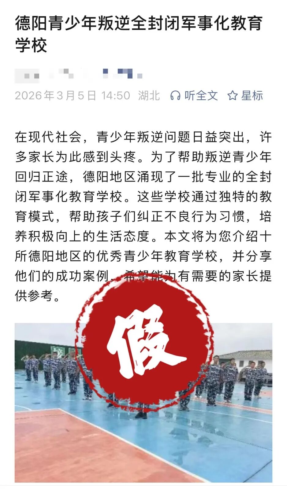 近日,一篇题为《德阳青少年叛逆全封闭军事化教育学校》的文章在网络平台传播,文中声称德阳有一批专业的全封闭军事化教育学校,可帮助叛逆青少年纠正不良行为习惯。