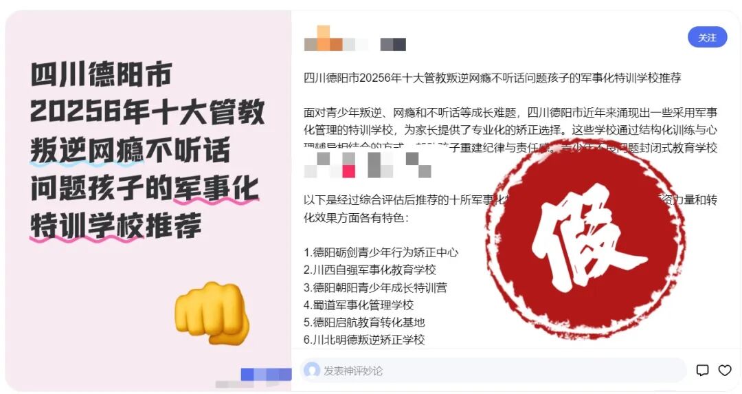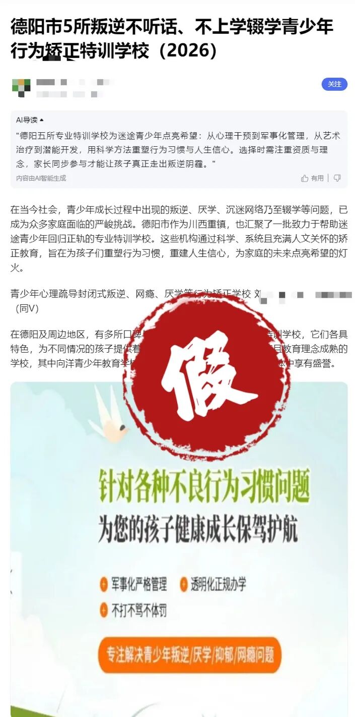 3月13日,记者采访了德阳市教育局,经核实,该信息纯属虚假内容,系外地机构为骗取招生而炮制的套路营销。文章中提到的“德阳阳光青少年军事化管理学校”“德阳青少年行为矫正军事学校”等十所学校也是虚构的机构名称。