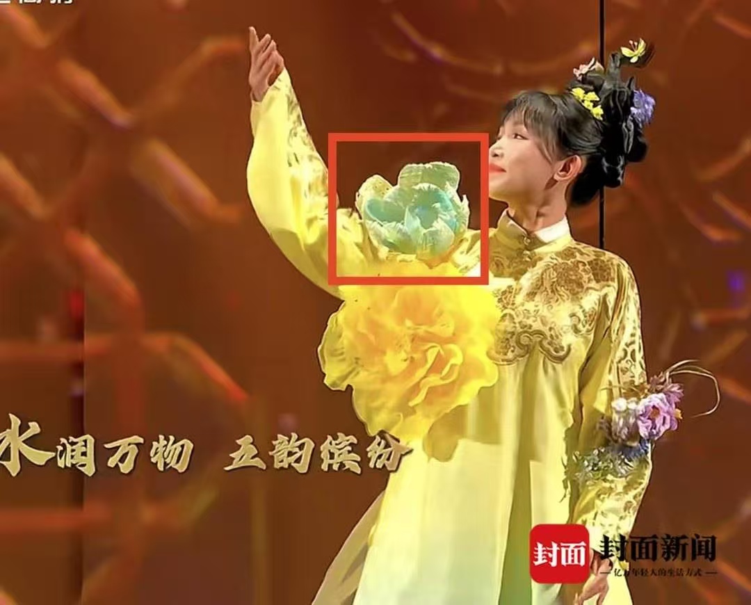 李子柒肩头上的这朵青绿色牡丹花,正是由眉山青神竹编编织而成。图据总台春晚
