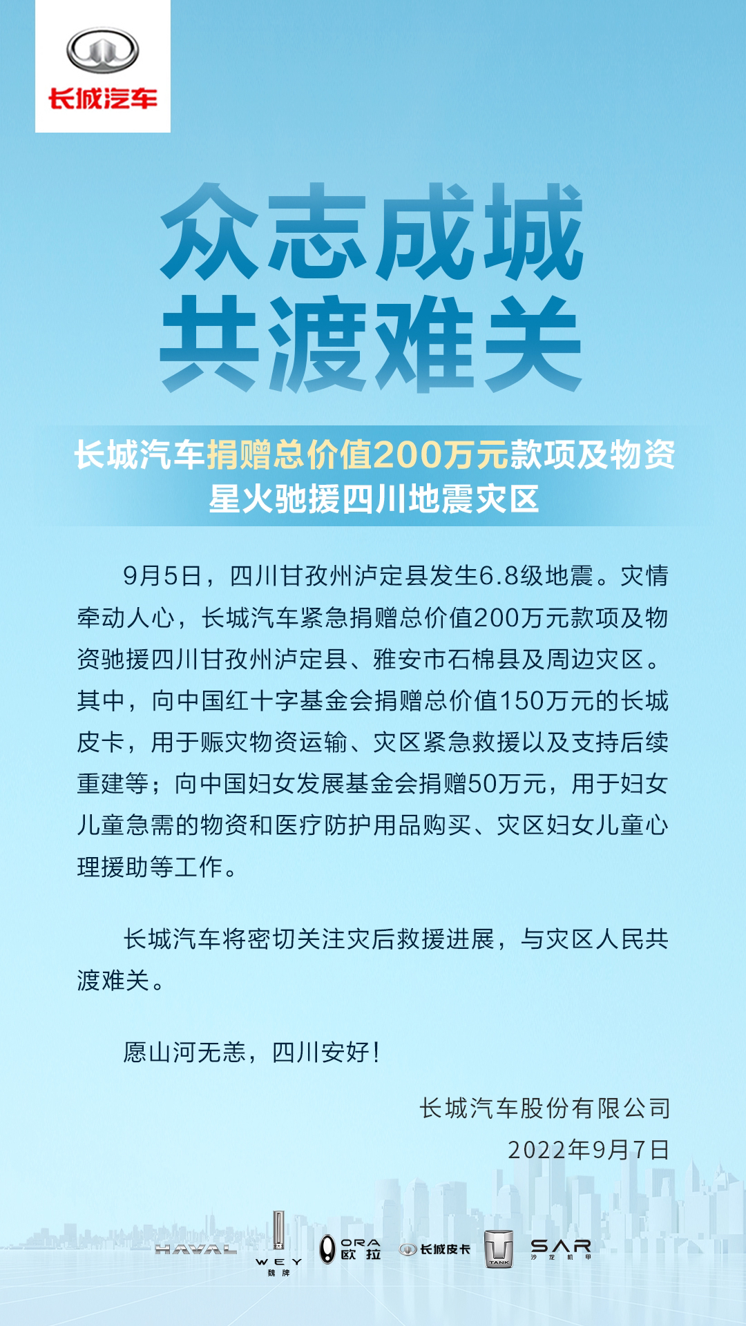 9月7日,封面新闻从长城汽车获悉,长城汽车捐赠总价值200万元款项及物资,驰援四川地震灾区。