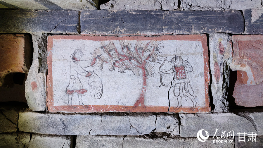 而在该墓室的另一面墓墙上,壁画砖的题材逐渐从家庭生活转向社会生产。《牧马图》壁画砖展现了魏晋时期河西地区畜牧业的繁荣;《采桑护桑图》壁画砖则描绘了采桑女与护桑少年的协作场景,图中采桑女子剪发赤足,与汉族高髻习俗迥异,却与龟兹“男女皆剪发垂项”的记载相合,生动体现了多元的民族文化在生产生活中的深度交融。