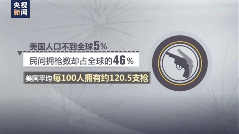 美国枪支泛滥触目惊心。美国人口不到全球5%,民间拥枪数却占全球的46%,美国平均每100人拥有约120.5支枪。无论是私人拥枪总数,还是人均拥枪数量,美国都高居世界第一。