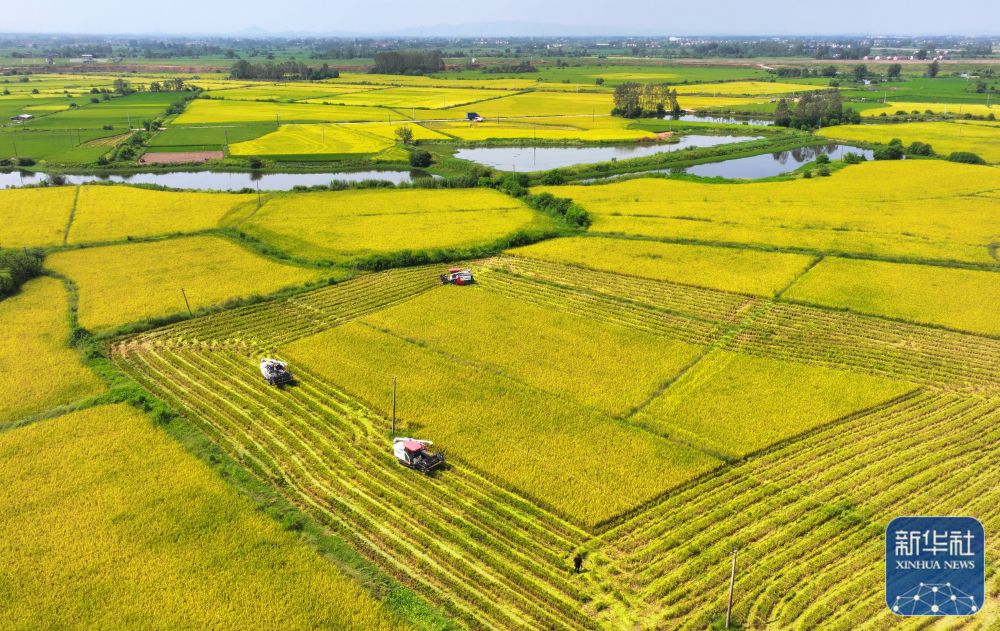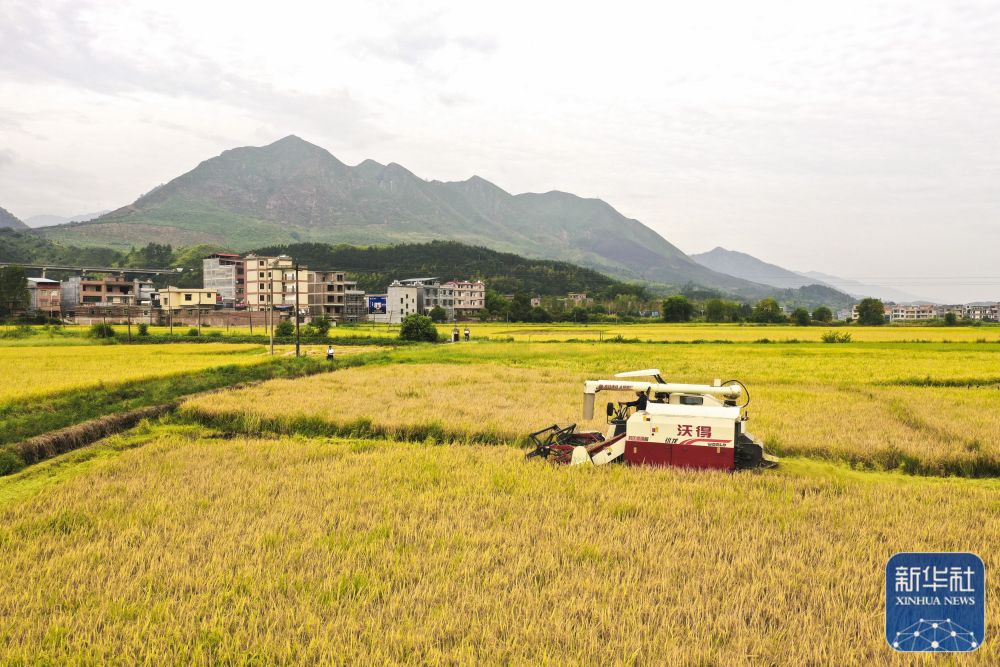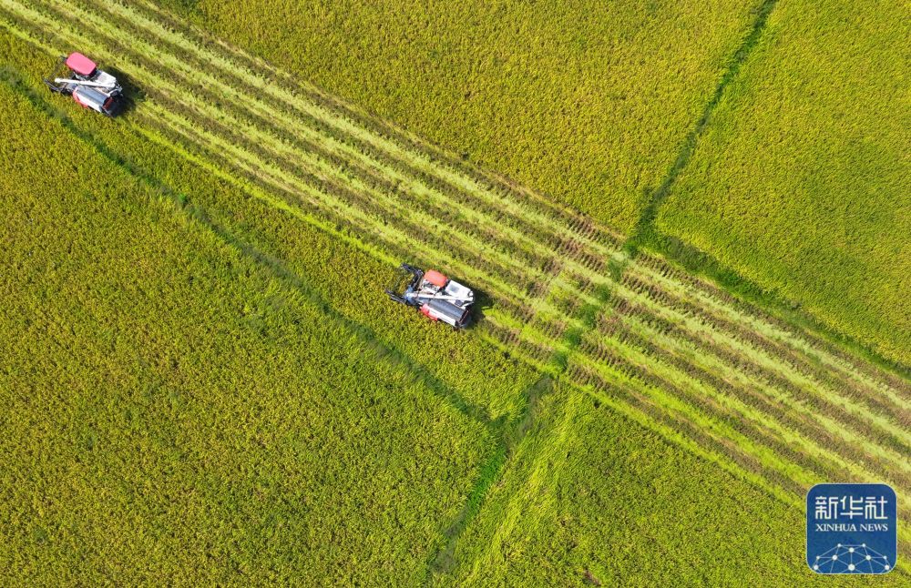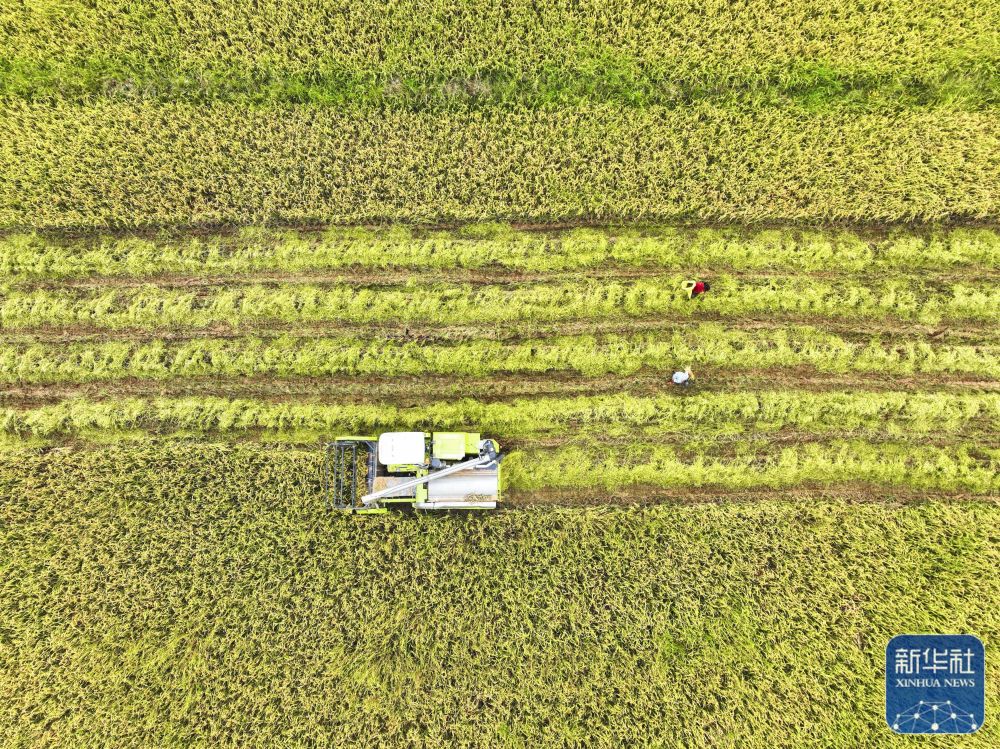 8月21日,湖南省常宁市庙前镇泉井村农民驾驶农机在收获水稻(无人机照片)。新华社发(周秀鱼春 摄)