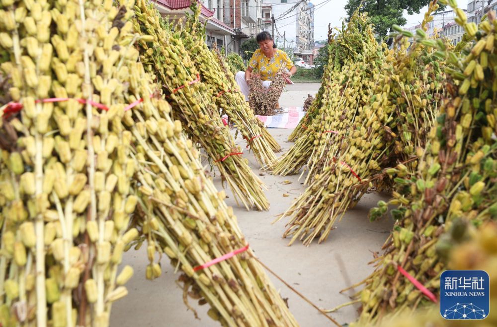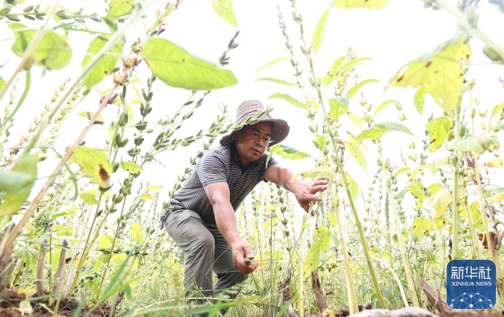 8月21日,在湖南省衡阳市衡东县大浦镇,当地村民在收割芝麻。新华社发(曹正平摄)