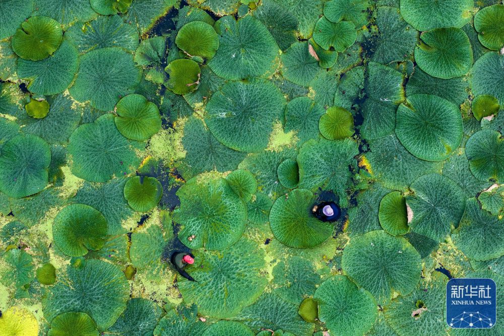 8月21日,江苏省泰州市姜堰区顾高镇申俞村农民在采收芡实(无人机照片)。新华社发(汤德宏 摄)