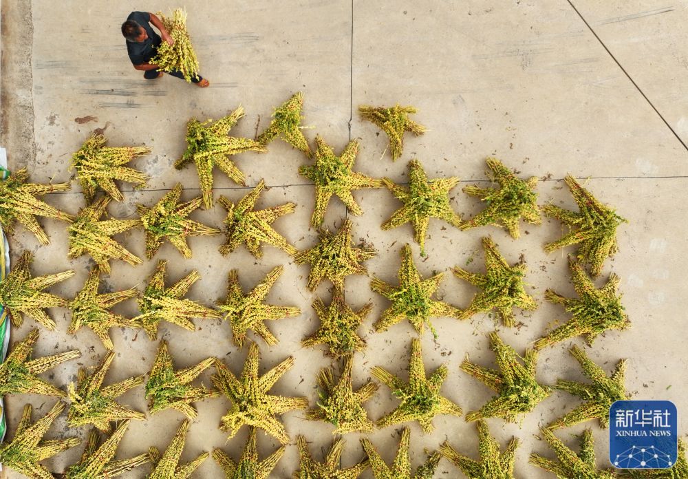 8月21日,在湖南省衡阳市衡东县大浦镇,当地村民在晾晒芝麻(无人机照片)。新华社发(曹正平摄)