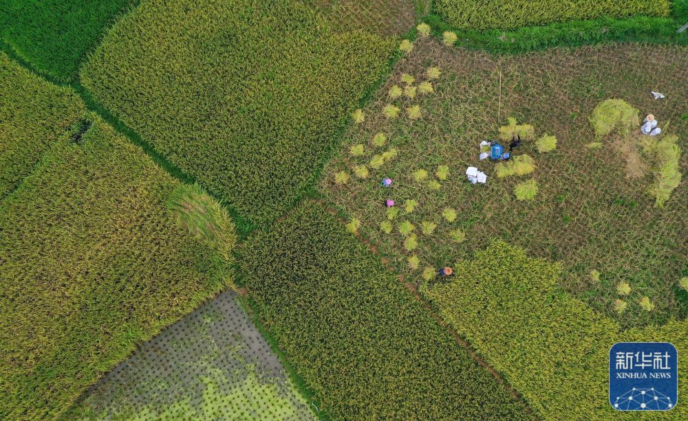 8月21日,村民在贵州省黔东南苗族侗族自治州从江县刚边壮族乡平中村田间收获水稻(无人机照片)。新华社发(罗京来 摄)