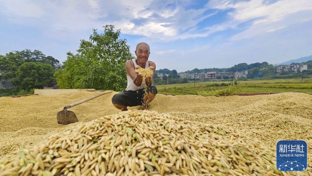 8月20日,湖南省常宁市板桥镇西洞村农民展示刚收获的稻谷。新华社发(周秀鱼春 摄)