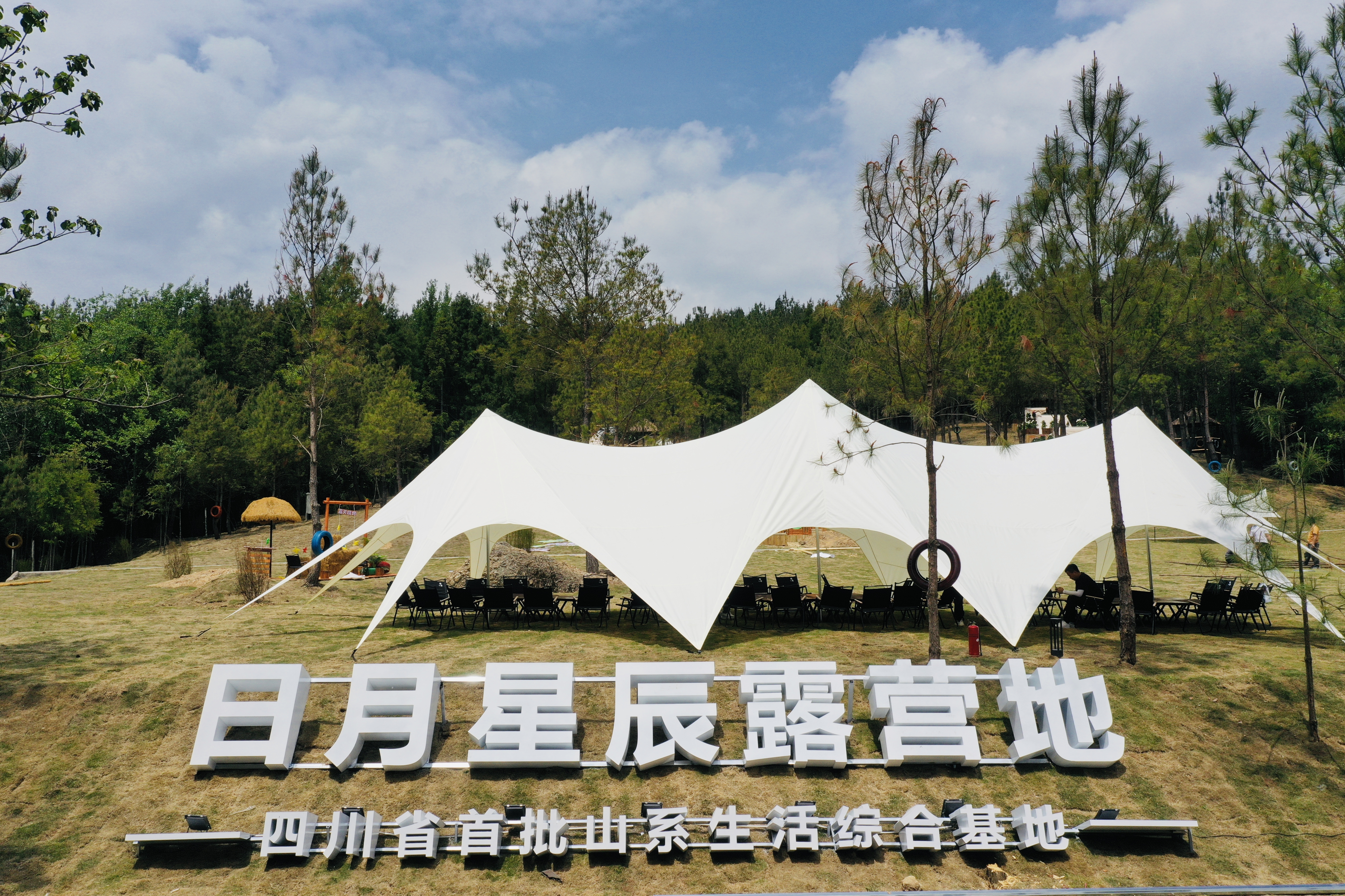 日月星辰露营地,2023年4月开张,占地20亩,是四川第一个山系生活综合基地。营地藏在柳杉林里,13个固定营位加60个临时营位,能同时接待200人。