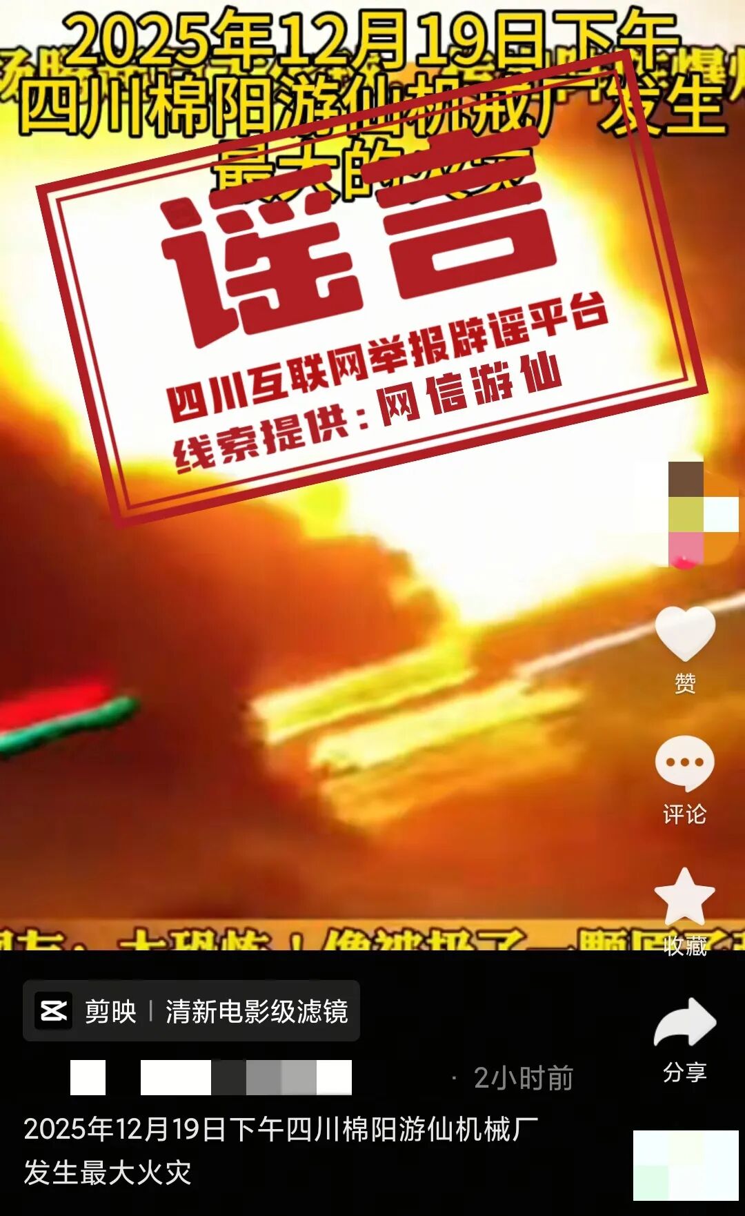 近日,有网民发布视频称“游仙区一机械厂发生火灾”,经与消防部门核实,消防部门未接到过类似火情,此消息纯属谣言。
