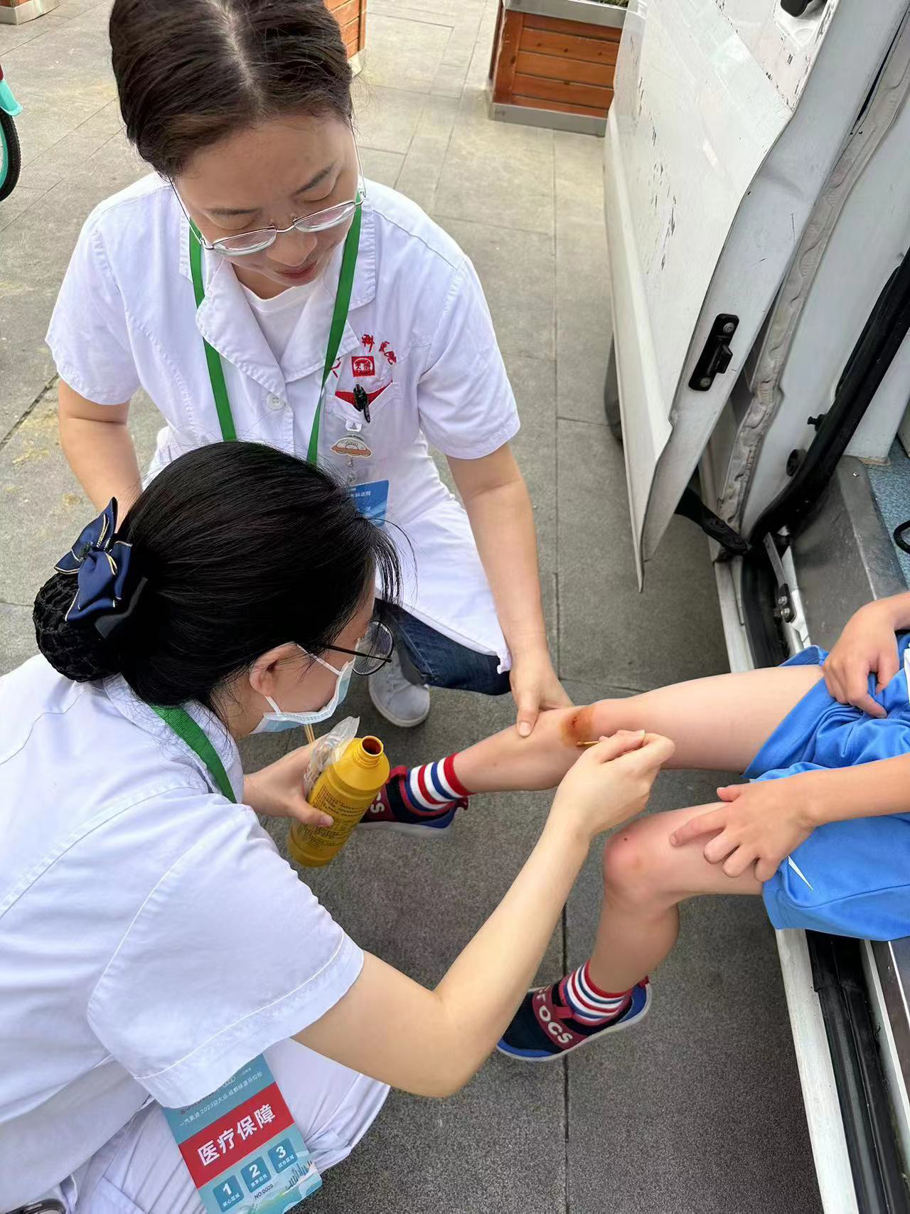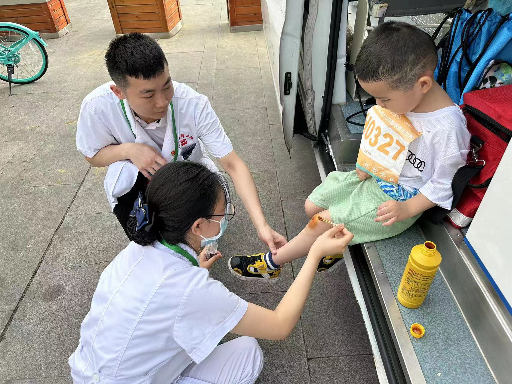 记者看到,马拉松赛过程中,有一名小选手膝盖擦伤,医护人员得知后迅速处理,快速为小选手进行了伤口处理。