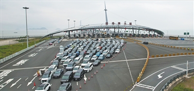 港珠澳大桥上,大批车辆正通过珠海公路口岸入境。 黎钊德摄(人民视觉)