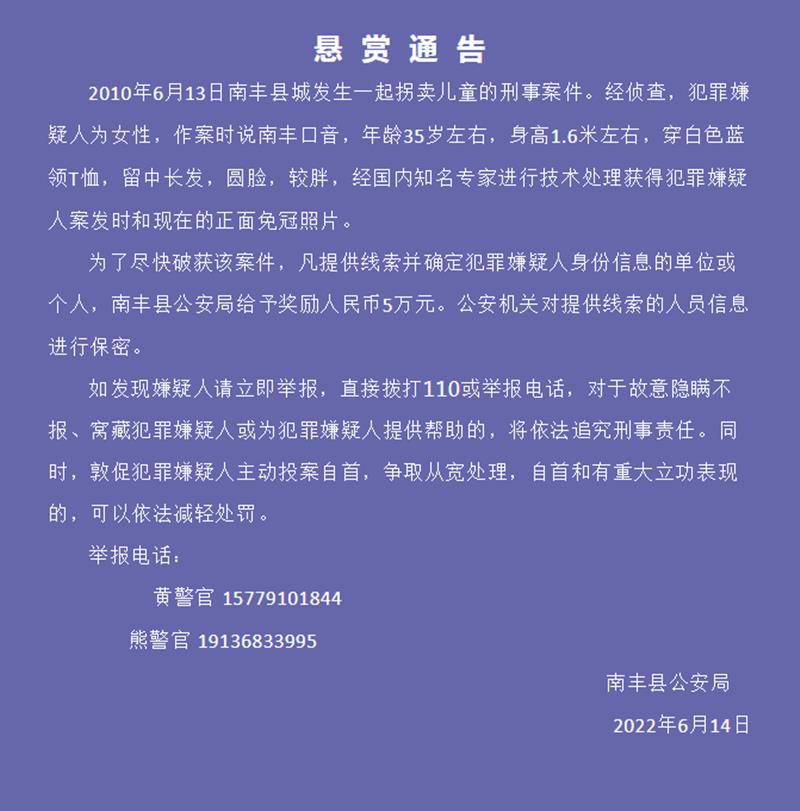 在今年公安部部署的“百日行动”中,南丰警方对该案又进行了全面梳理,并请专家重新画像,大量比对血型,并于今年6月14日发布了5万元的悬赏通告。办案人员通过对案发时的视频监控进行画像处理,走访调查、比对核实信息等方式,最终锁定了犯罪嫌疑人陈某的真实身份并将其抓获。经审讯,事发当时陈某对家人称自己在医院生孩子,并将拐骗的孩子抱回家抚养。