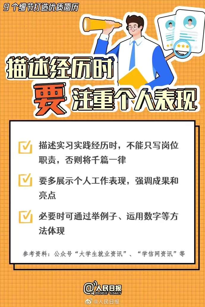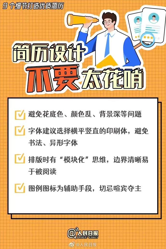 春季招聘进行时,一组简历优化小建议:①不要“一张简历走天下”,人岗匹配很重要。②字数不是越多越好,重点内容宜前置。③设计不要太花哨,简洁明了最有效。更多简历优化小妙招↓↓愿你早日收获心仪的offer!网友:不注意这些细节简历就白投了