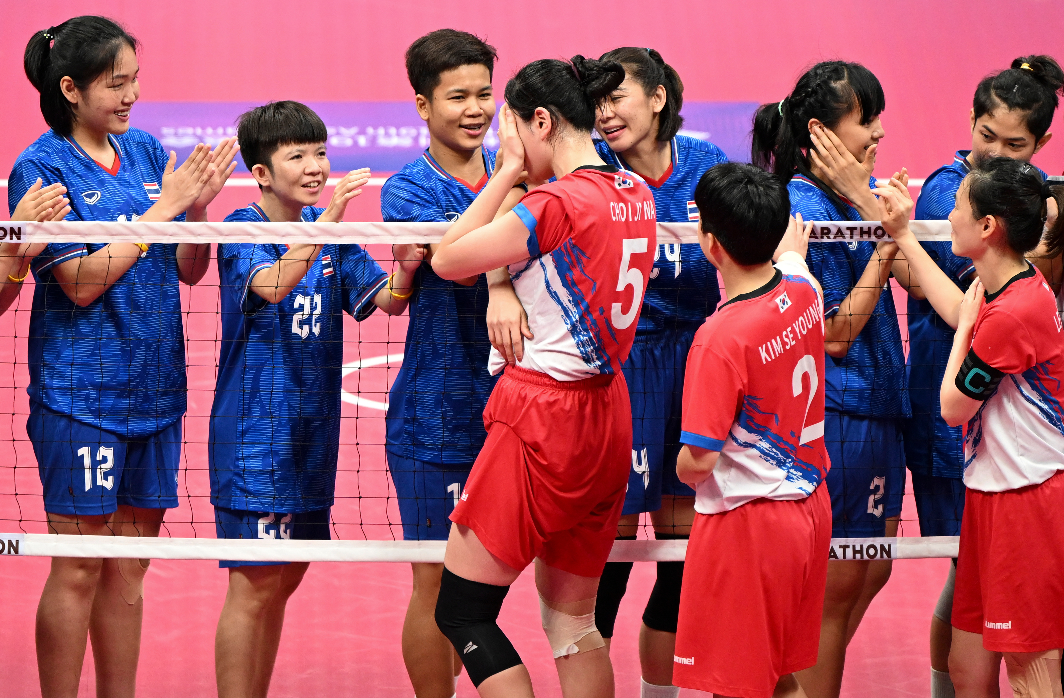 9月29日,泰国队队员在赛后安慰哭泣的韩国队选手崔智娜(前右三)。新华社记者 陈钟昊 摄