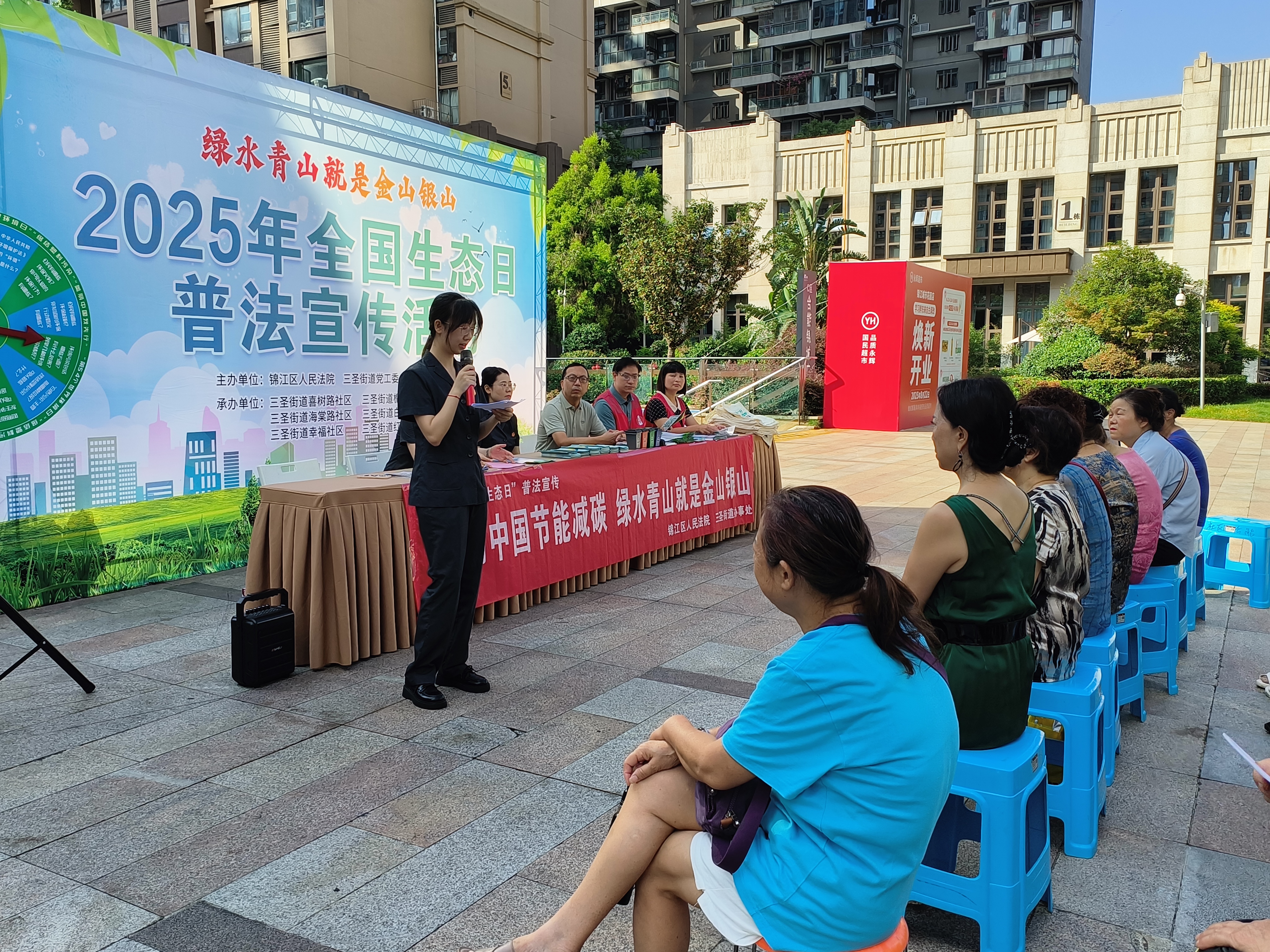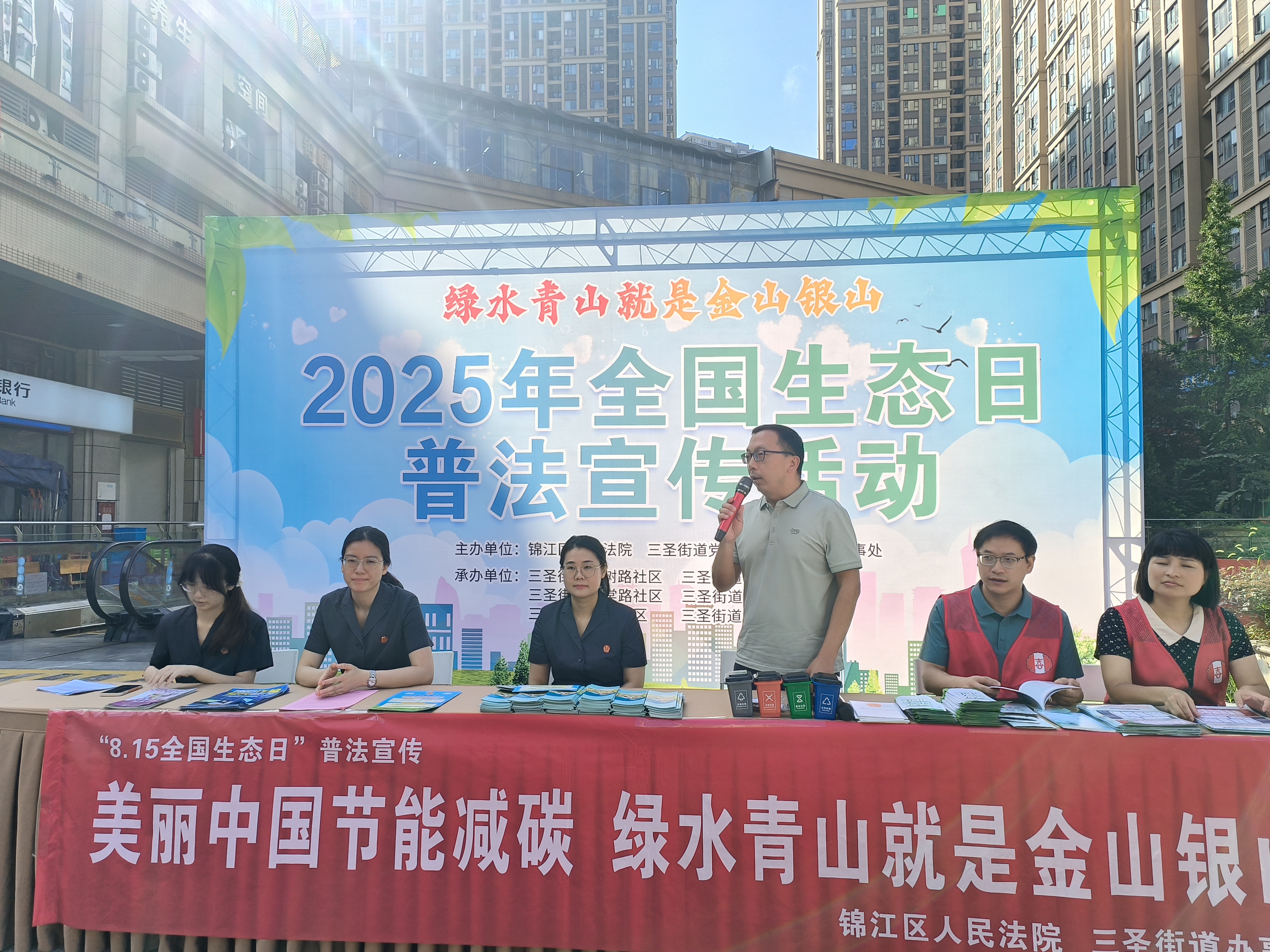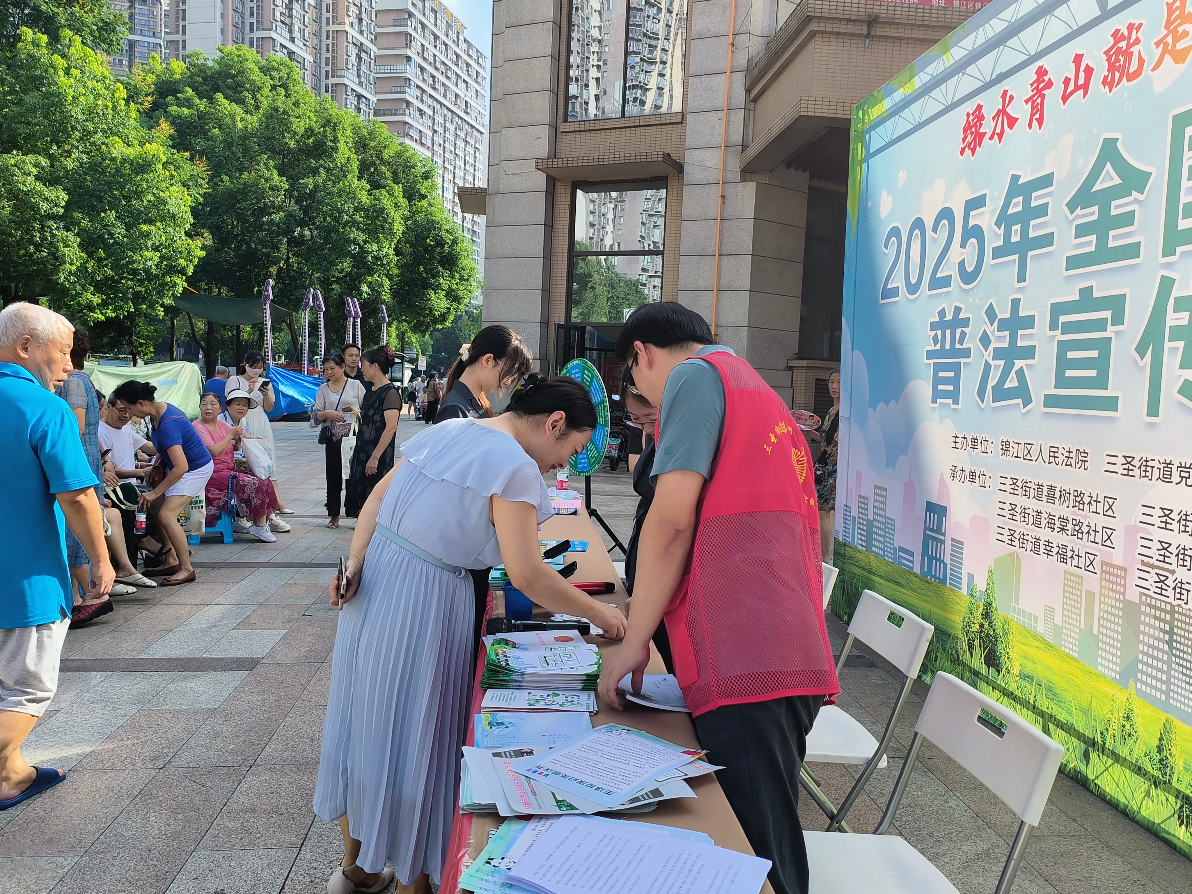 8月12日上午,成都市锦江区三圣街道办事处联合锦江区人民法院,在喜树路社区合能锦城广场共同举办主题为“绿水青山就是金山银山——的全国生态日普法宣传”活动,区法院8名干警与三圣街道辖区11名“两代表一委员”参与。