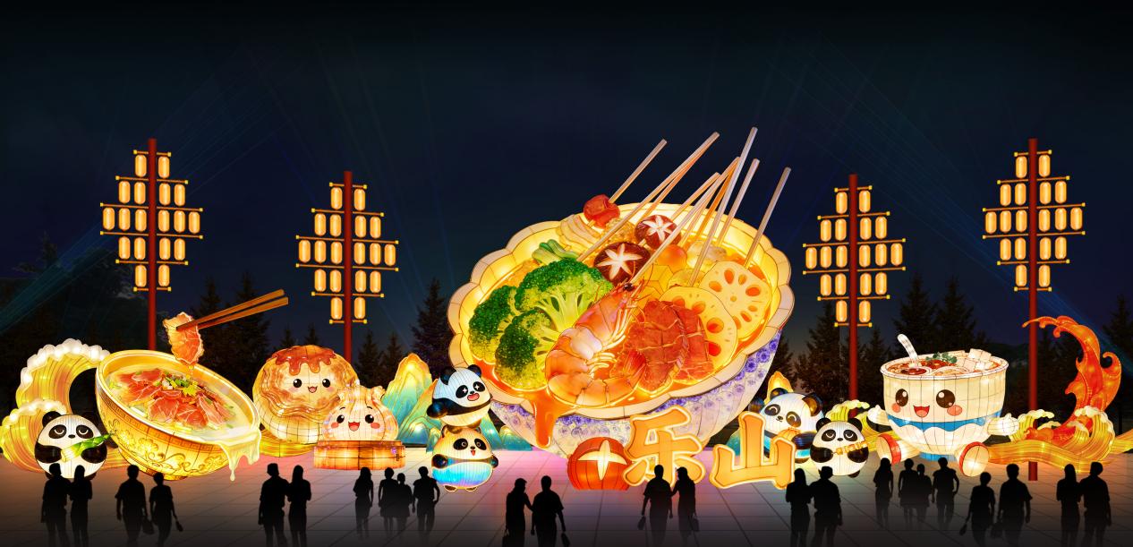 例如,《畅游九峰》《海棠贺春》《椒艳乐山》《乐山美食》等主题灯组,都是巧妙融合凌云九峰、乐山市花以及豆腐脑、钵钵鸡、跷脚牛肉等乐山在地文化与彩灯光影美感的完美体现,营造出灵动的夜游氛围。