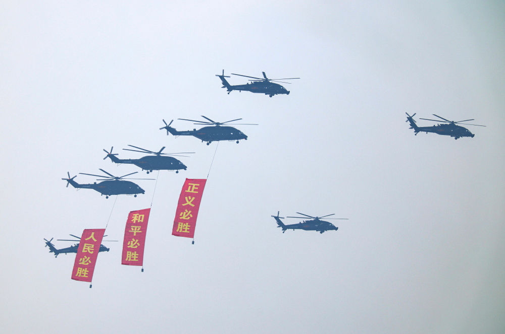 9月3日,纪念中国人民抗日战争暨世界反法西斯战争胜利80周年大会在北京隆重举行。这是空中护旗梯队接受检阅。新华社记者王婧嫱摄