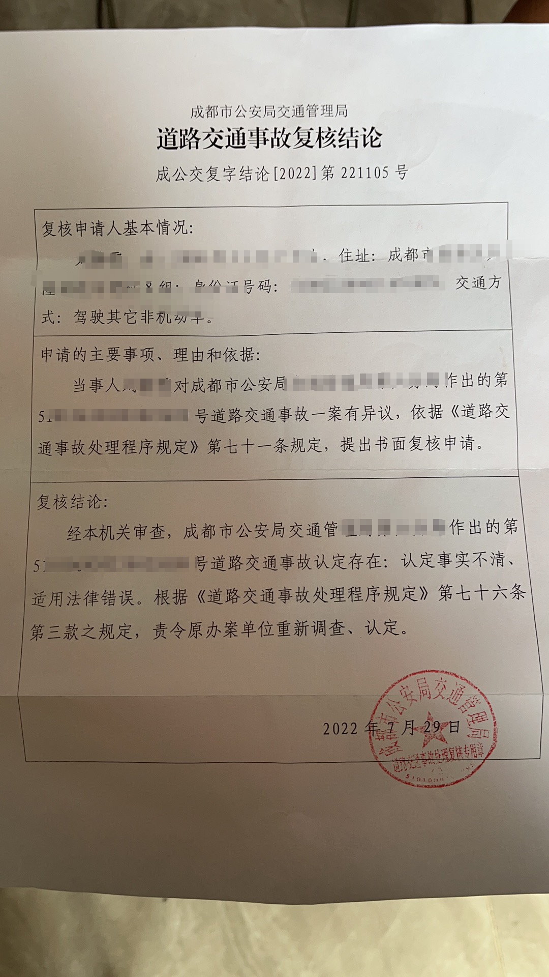 道路交通事故复核结论