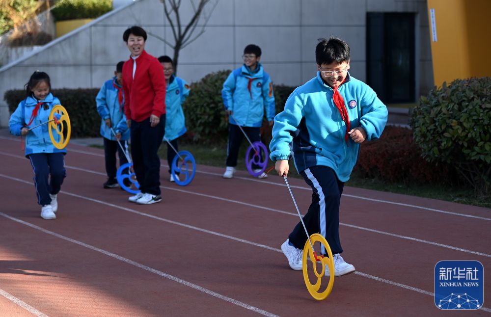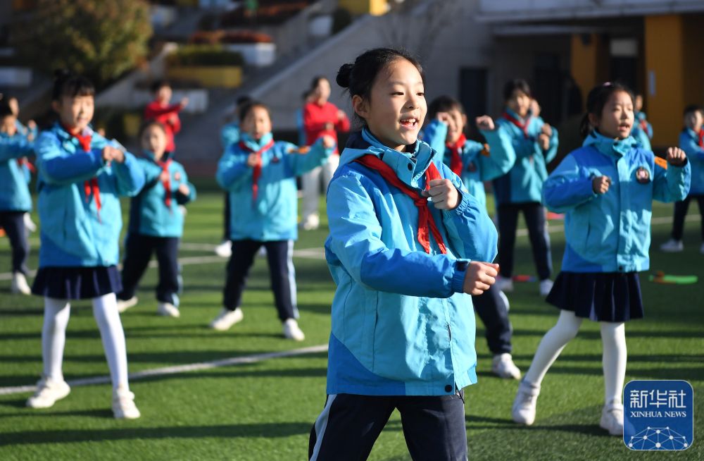 11月27日,西安市曲江第六小学学生在大课间做五禽操。