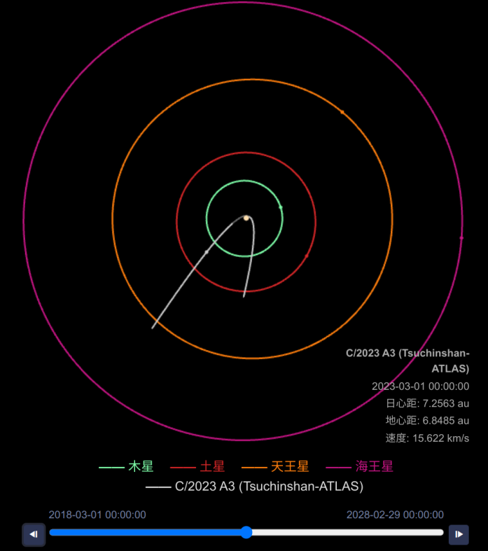 该彗星轨道倾角约139度,是一颗逆行轨道彗星;偏心率超过0.999,在一个近抛物线的椭圆轨道上运动,轨道周期为61751年。根据目前的轨道信息,C/2023 A3 (Tsuchinshan-ATLAS)目前还处在木星轨道以外,后续将朝着它的近日点方向运动,在2024年8月穿过地球的轨道,至2024年9月28日可到水星轨道附近。
