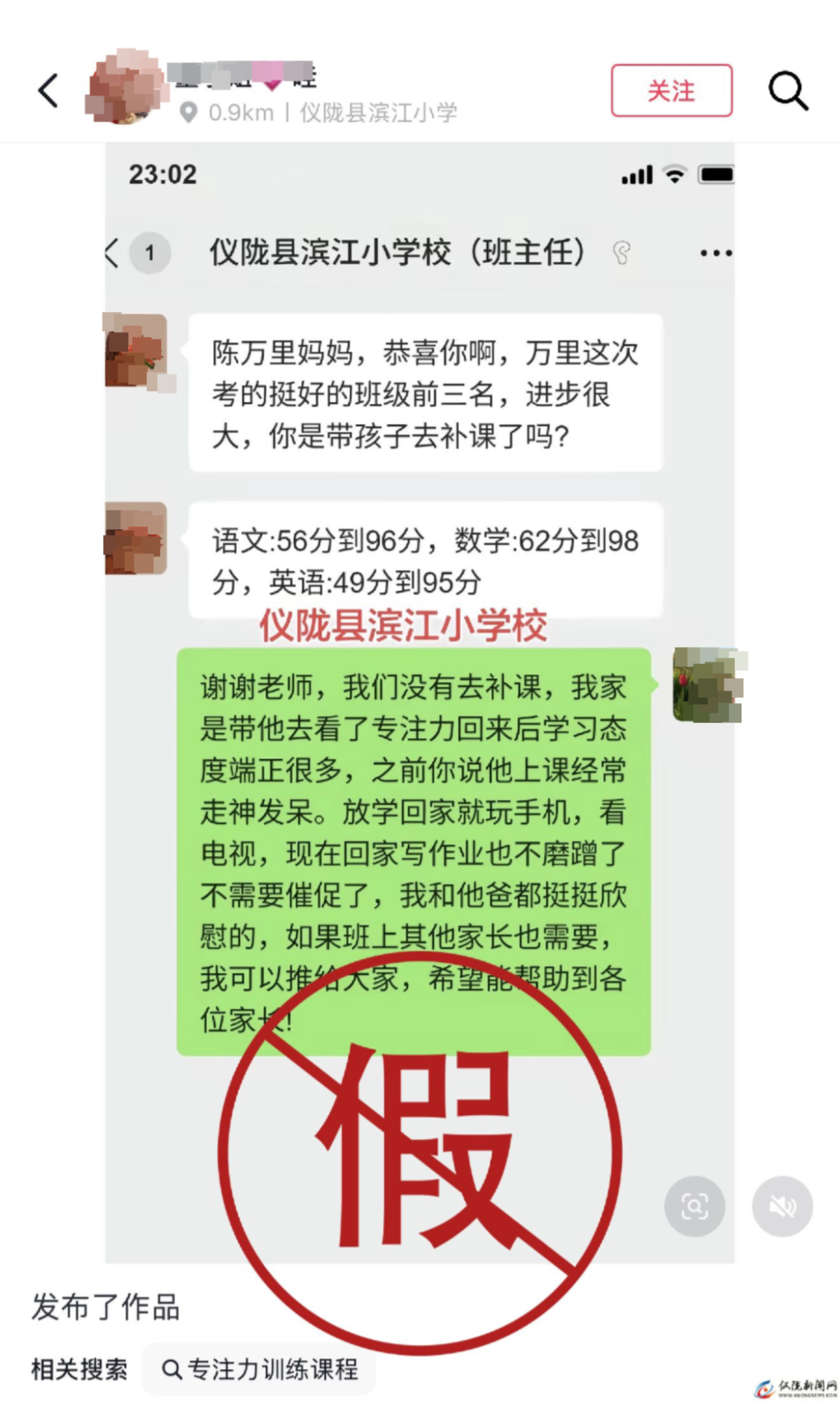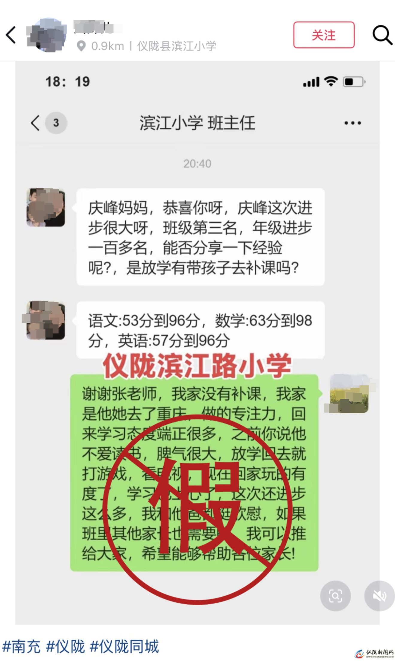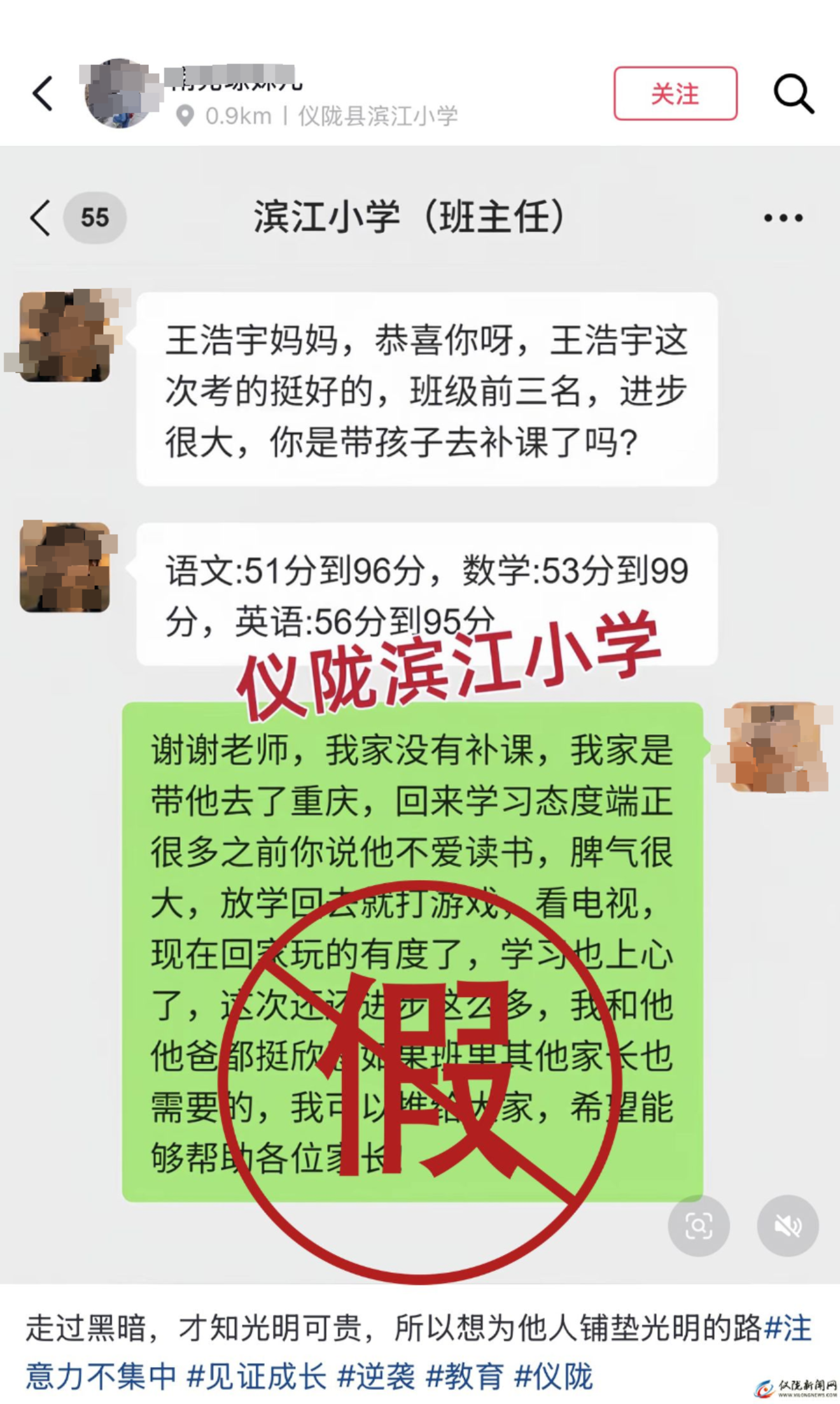近日,我局接到多起群众反映,在短视频平台上广泛传播着几张“喜报”截图。截图内容显示,有昵称为“南充琼妹儿”“川妹儿”的用户,冒用“仪陇县滨江小学”教师及家长的身份,通过微信聊天对话的形式,宣称孩子通过某项“专注力训练”后,成绩从及格线左右“逆袭”至班级前三名 。在此,仪陇县教育和体育局郑重发布官方辟谣: