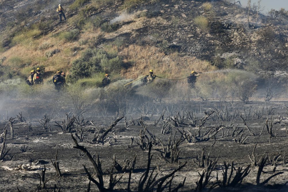 6月16日,消防队员在美国加利福尼亚州洛杉矶县西北部的戈曼地区进行灭火作业。新华社发