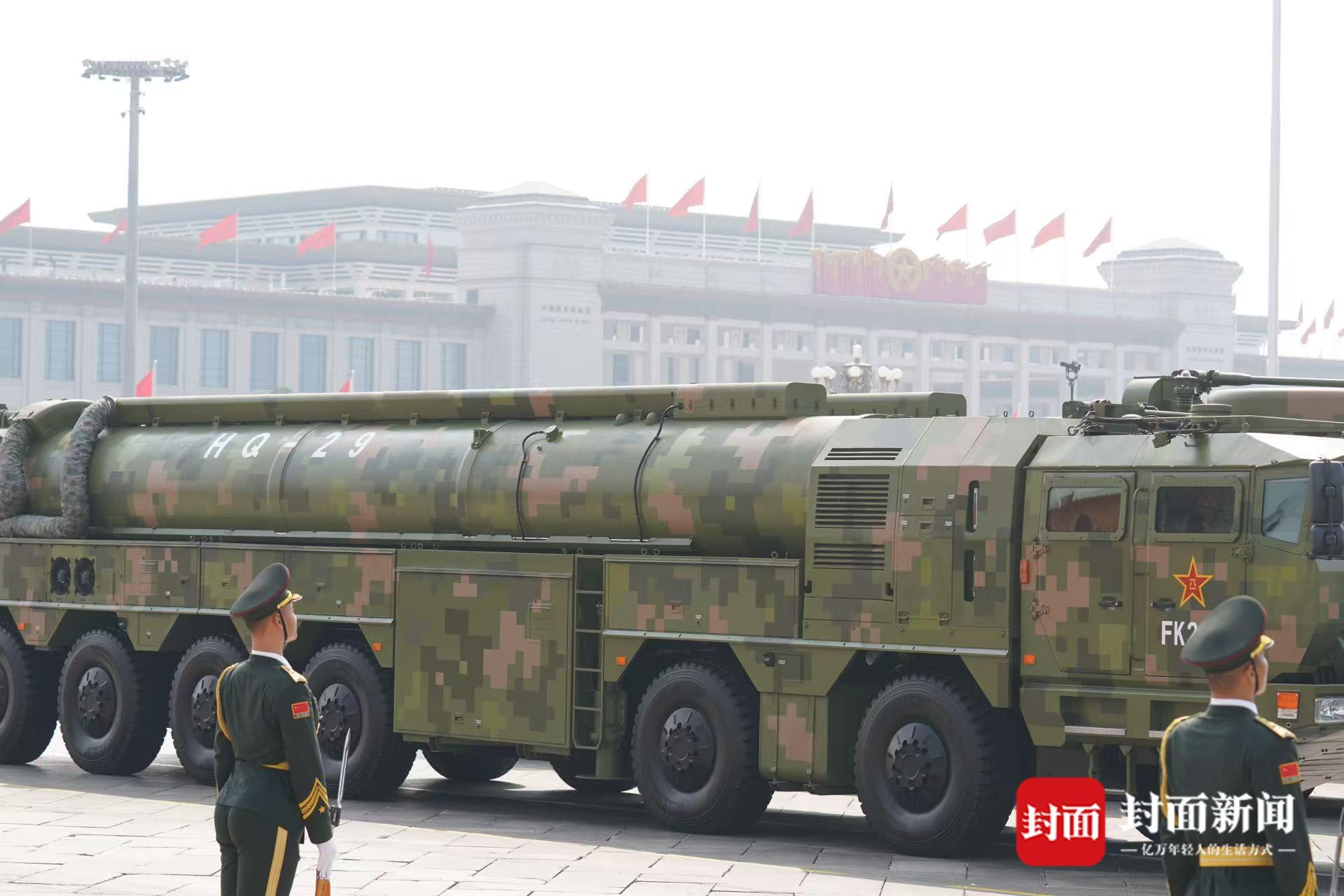 在对空抗击方队中,记者看到,红旗-20、红旗-19、红旗-29等6型装备首次亮相天安门广场。远中近程防空抗击,构筑起坚固空天屏障,从红旗-19到红旗-29,我国防空反导领域技术不断进步。