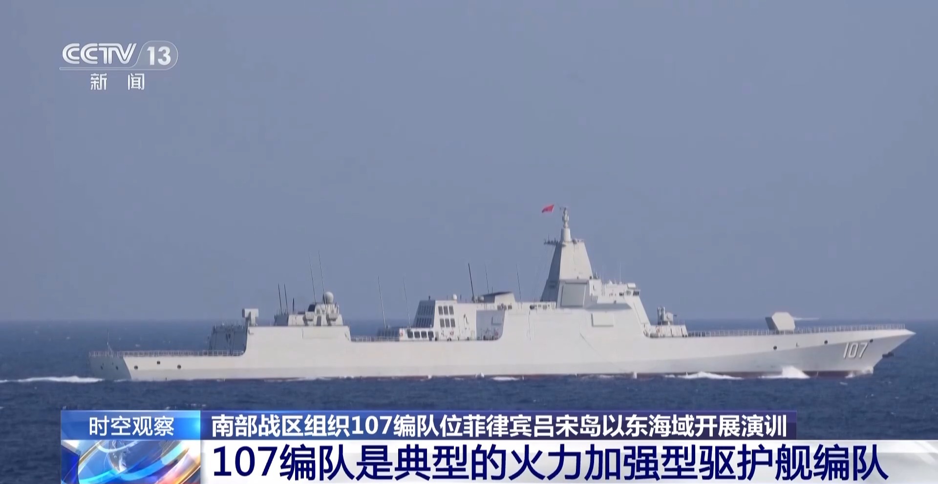 总台军事观察员 魏东旭:演训画面显示,107编队包括一艘055型驱逐舰、一艘052D型驱逐舰、一艘054A型护卫舰和一艘综合补给舰。这是一种典型的火力加强型的驱护舰编队。在编队当中,055型驱逐舰和052D型驱逐舰能够利用自身先进的相控阵雷达和远程的防空作战体系,为编队撑起严密的防空反导保护伞。