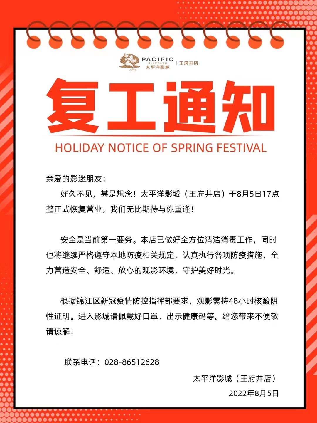 太平洋影城(王府井店)复工通知