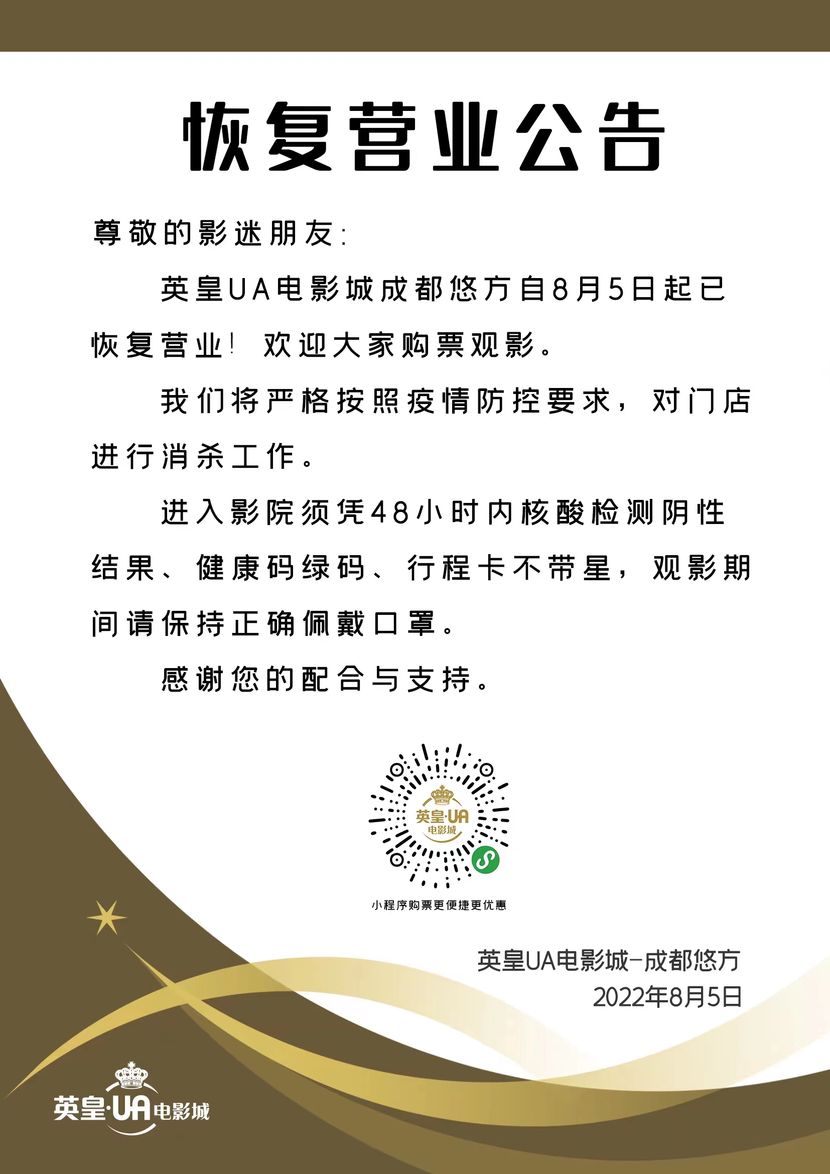 成都英皇UA影城复工通知