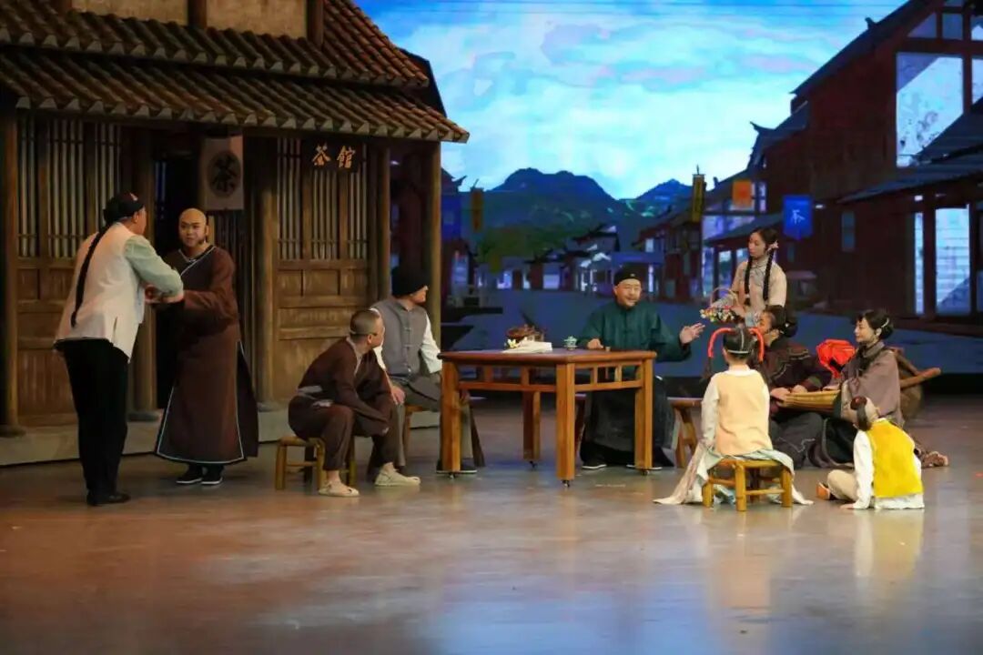 “门前是铜河水,河两岸住着谁,沙湾人在这里祖祖辈辈……”在悠悠的铜河号子声中,舞台帷幕缓缓拉开。青瓦白墙的街景、鼎沸的喧闹声,瞬间将观众带入了百年前的“沙湾场”。