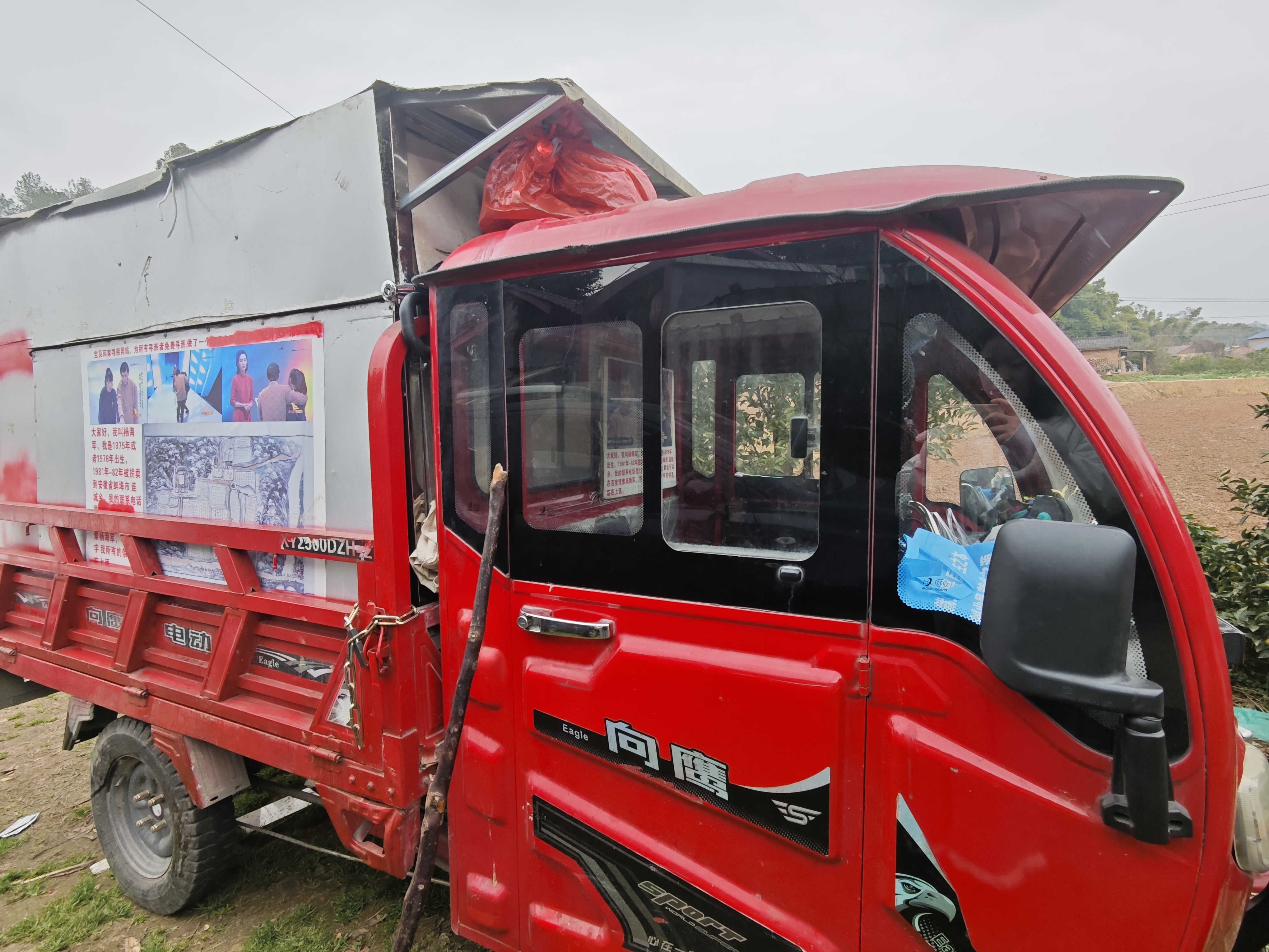 在江油期间,杨海军骑着这辆三轮车四处寻亲,车身上贴着寻亲信息。