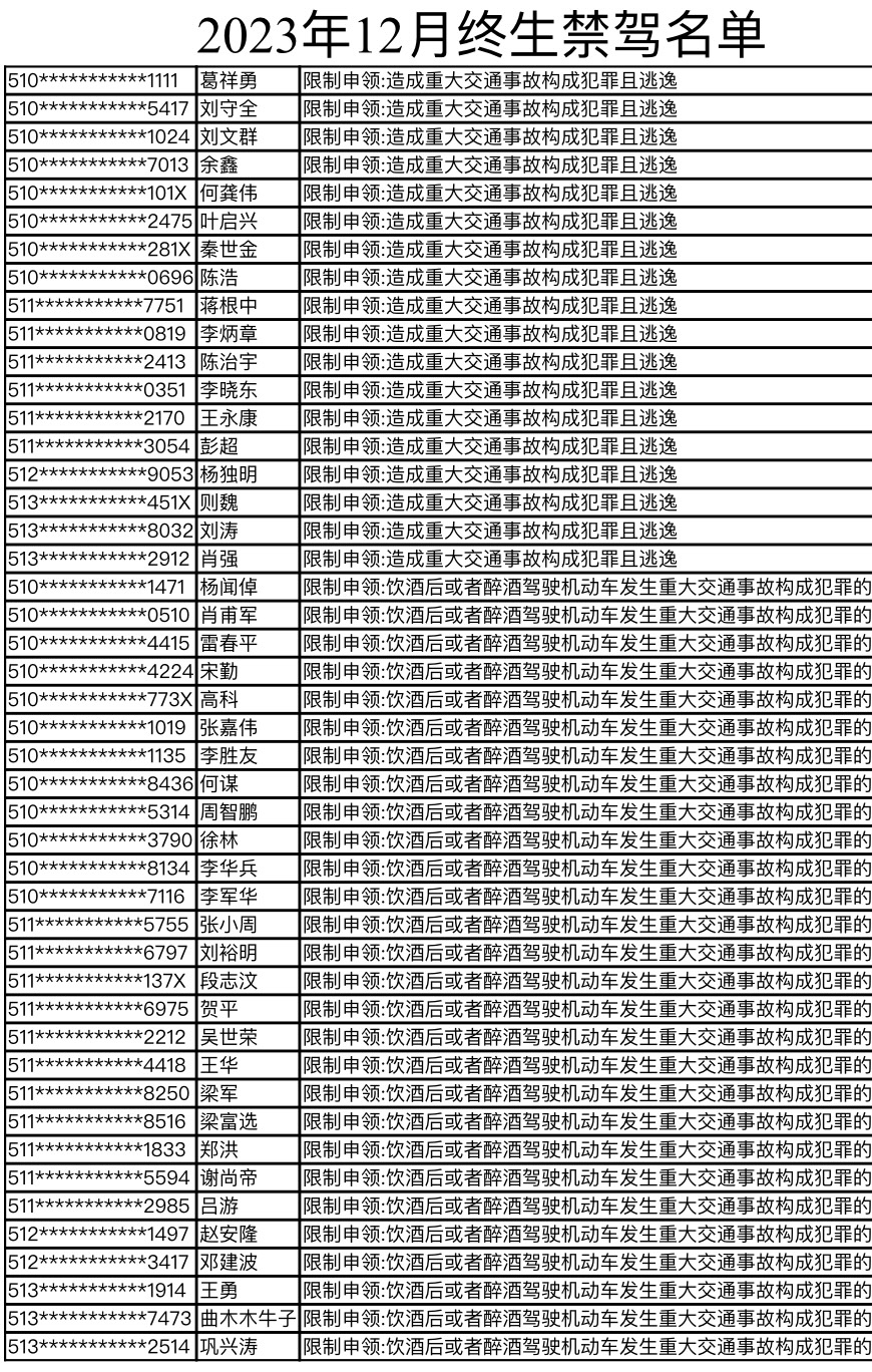 1月24日,四川省公安厅交警总队向社会集中公布了2023年12月被终生禁驾的46人名单,其中年龄最大的81岁,年龄最小的24岁。
