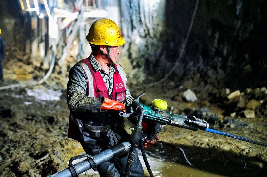 环北部湾广东水资源配置工程建设现场,工人进行中空锚杆钻孔作业。 程应军摄