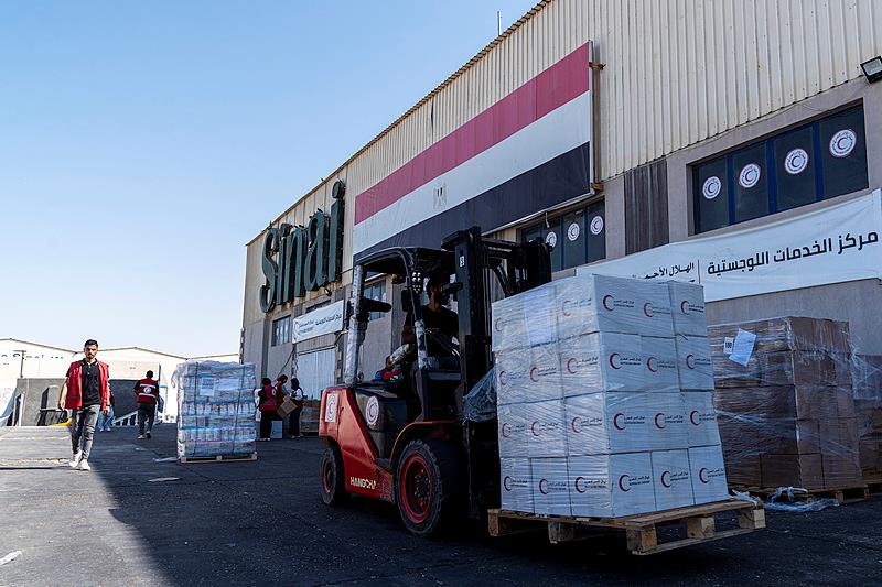 △当地时间10月16日,一辆叉车在埃及阿里什的援助仓库内运输人道主义援助物资。